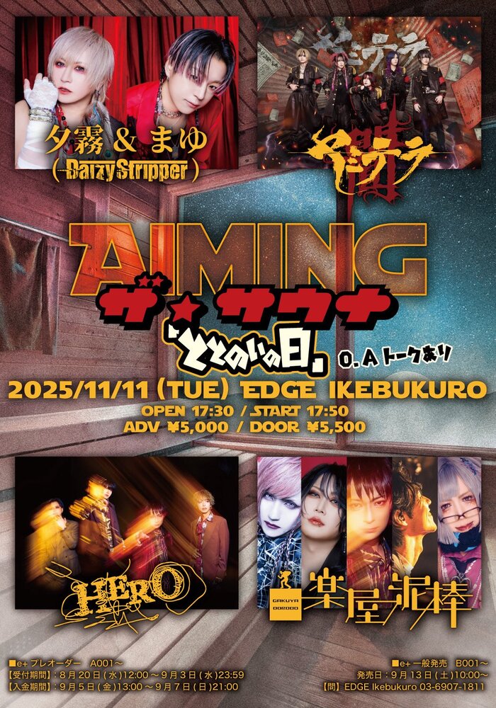 【夕霧&まゆ】『Aiming』THE SAUNA 「ととのいの日」 SCHEDULE 2025/11/11(火) 池袋EDGE 『Aiming』THE SAUNA 「ととのいの日」 O.Aトーク有り 2025年11月11日(火) EDGE Ikebukuro OPEN/START 17:30/17:50 URLをコピーする 報告する